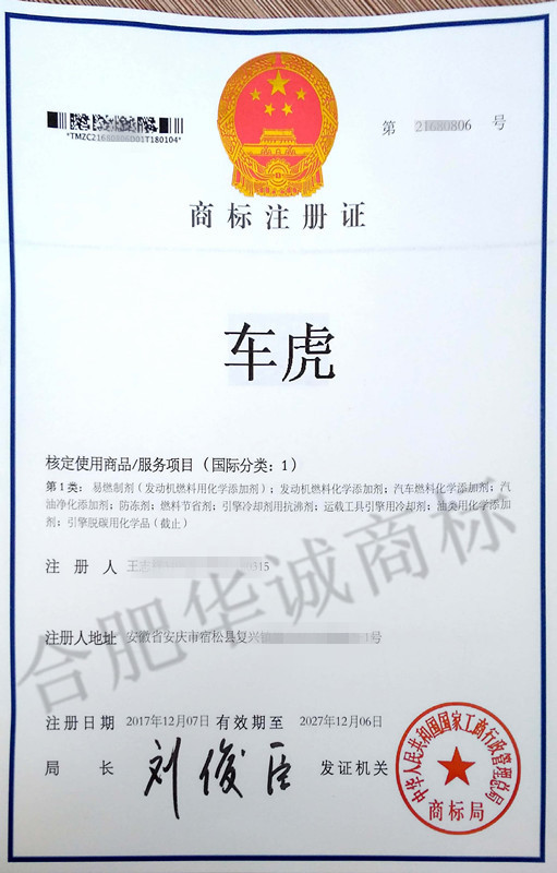 您委托我所代理商标注册申请,名称为“车虎” 1类商标注册证已下达。