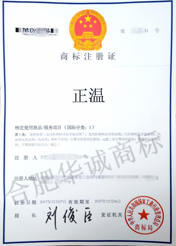 您委托我所代理商标注册申请,名称为“正温”1类商标注册证已下达。