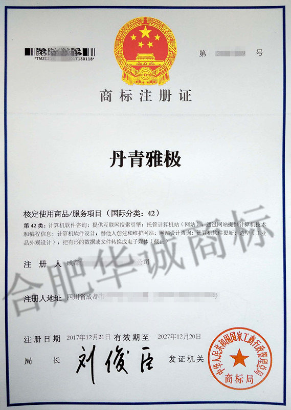 您委托我所代理商标注册申请,名称为“丹青雅极” 42类商标注册证已下达。