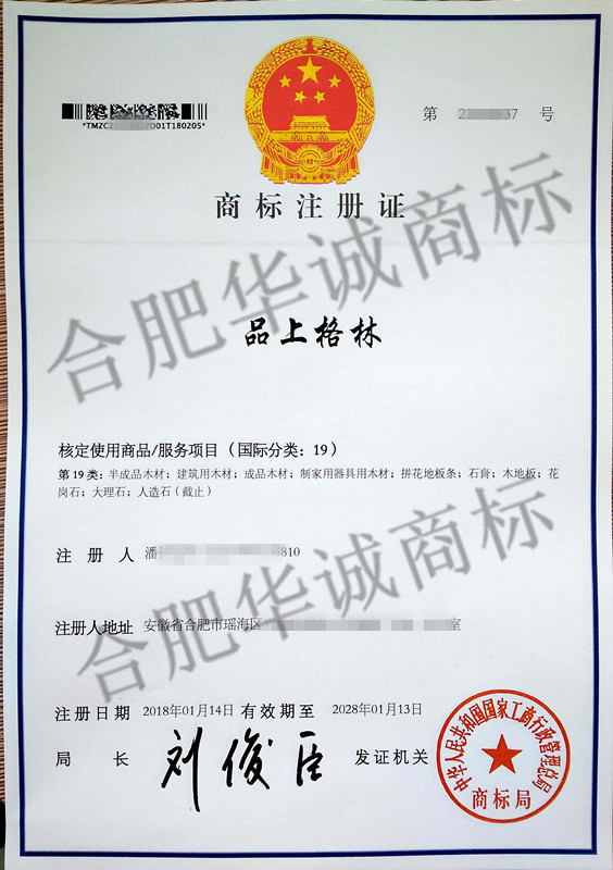 您委托我所代理商标注册申请,名称为“品上格林” 19类商标注册证已下达。