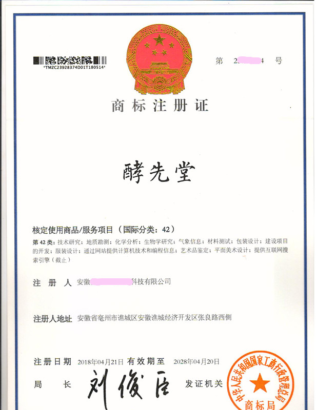 “酵先堂”42类商标注册证下达