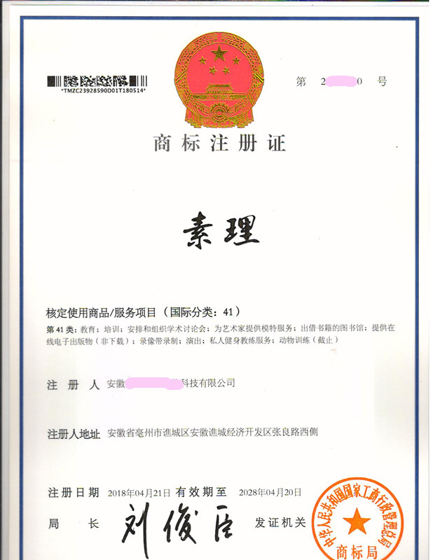 您委托我所代理商标注册申请,名称为“素理”41类商标注册证已下达。