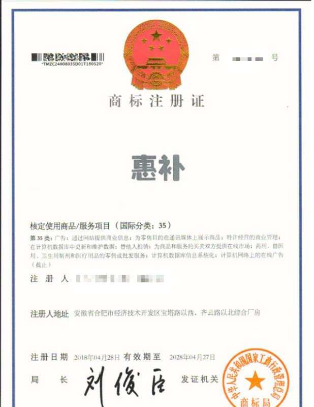 您委托我所代理商标注册申请,名称为“惠补”35类商标注册证已下达。