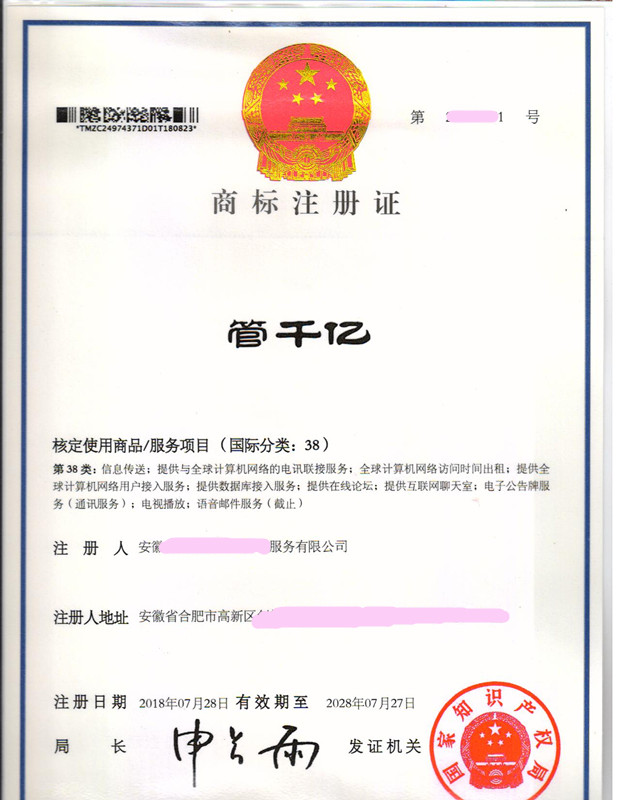 您委托我所代理商标注册申请,名称为“管千亿”38类商标注册证已下达。